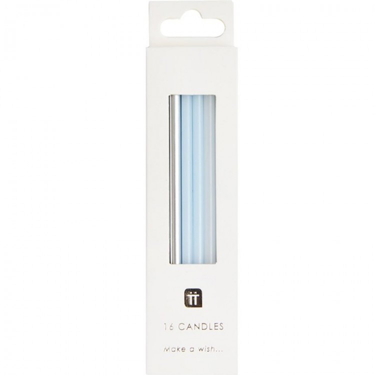 - 16 velas aniversário (5 prateadas, 6 azul claro e 4 brancas);